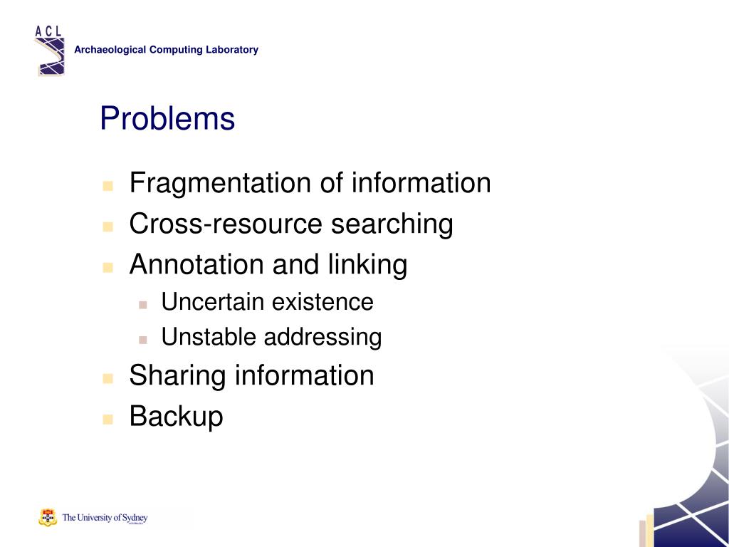Problems • Fragmentation of information • Cross-resource searching • Annotation and linking • Uncertain existence • Unstable addressing • Sharing information • Backup