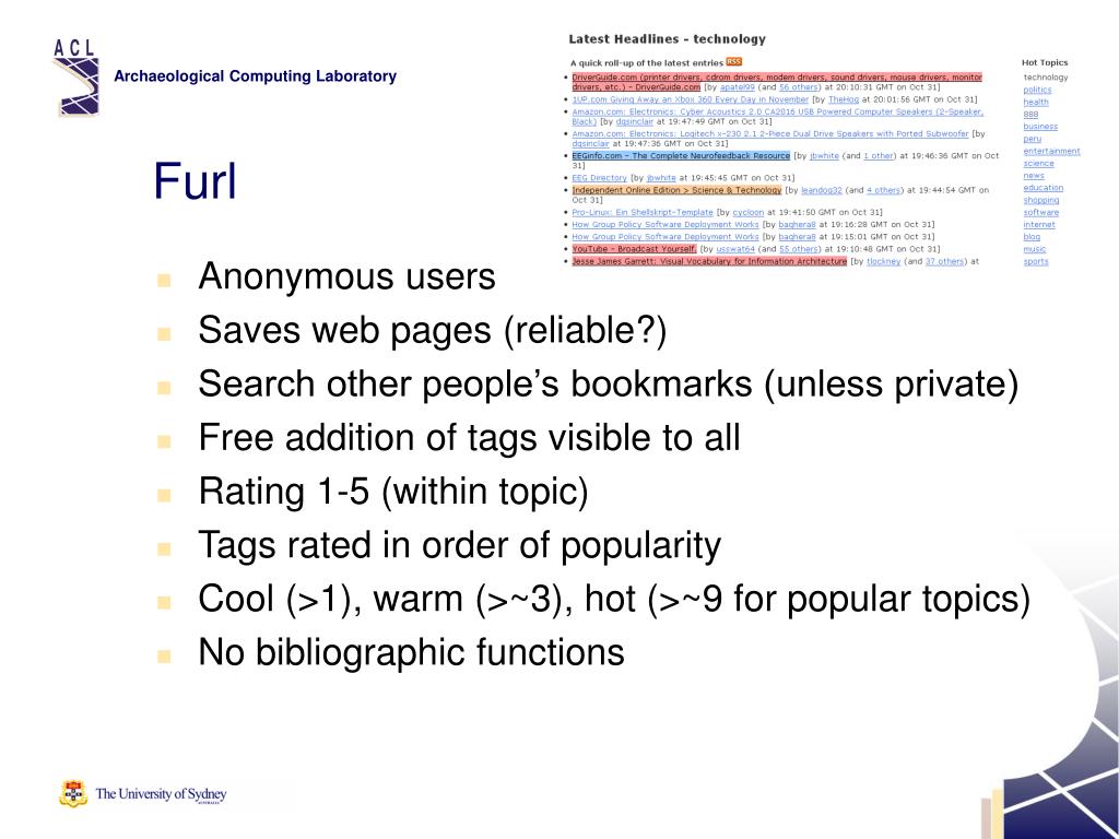 Furl • Anonymous users • Saves web pages (reliable?) • Search other people’s bookmarks (unless private) • Free addition of tags visible to all • Rating 1-5 (within topic) • Tags rated in order of popularity • Cool (>1), warm (>~3), hot (>~9 for popular topics) • No bibliographic functions