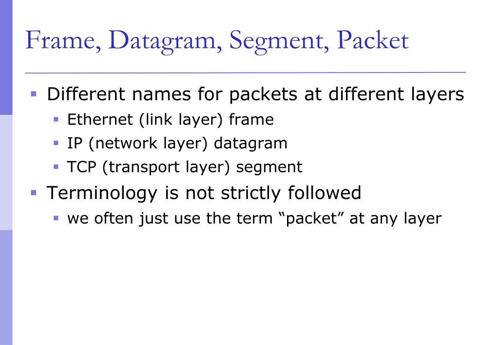 Frame, Datagram, Segment, Packet • Different names for packets at different layers • Ethernet (link layer) frame • IP (network layer) datagram • TCP (transport layer) segment • Terminology is not strictly followed • we often just use the term “packet” at any layer