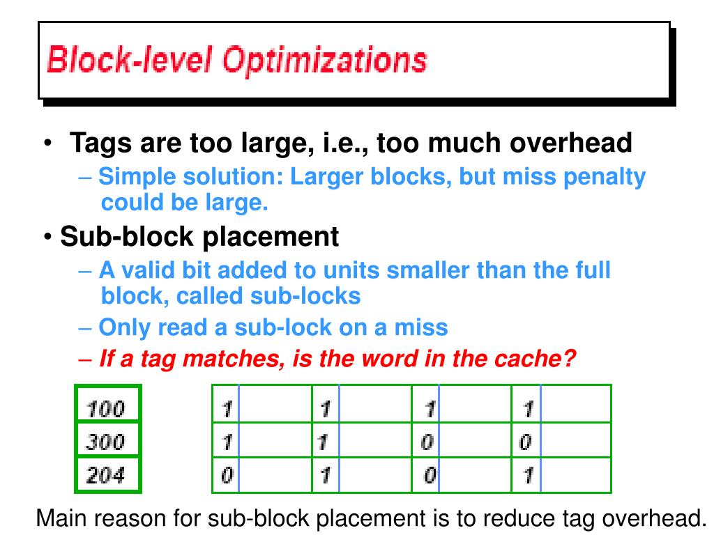 Tags are too large, i.e., too much overhead – Simple solution: Larger blocks, but miss penalty could be large. • Sub-block placement – A valid bit added to units smaller than the full block, called sub-locks – Only read a sub-lock on a miss – If a tag matches, is the word in the cache? Main reason for sub-block placement is to reduce tag overhead.