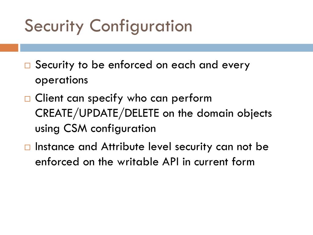 Security Configuration • Security to be enforced on each and every operations • Client can specify who can perform CREATE/UPDATE/DELETE on the domain objects using CSM configuration • Instance and Attribute level security can not be enforced on the writable API in current form