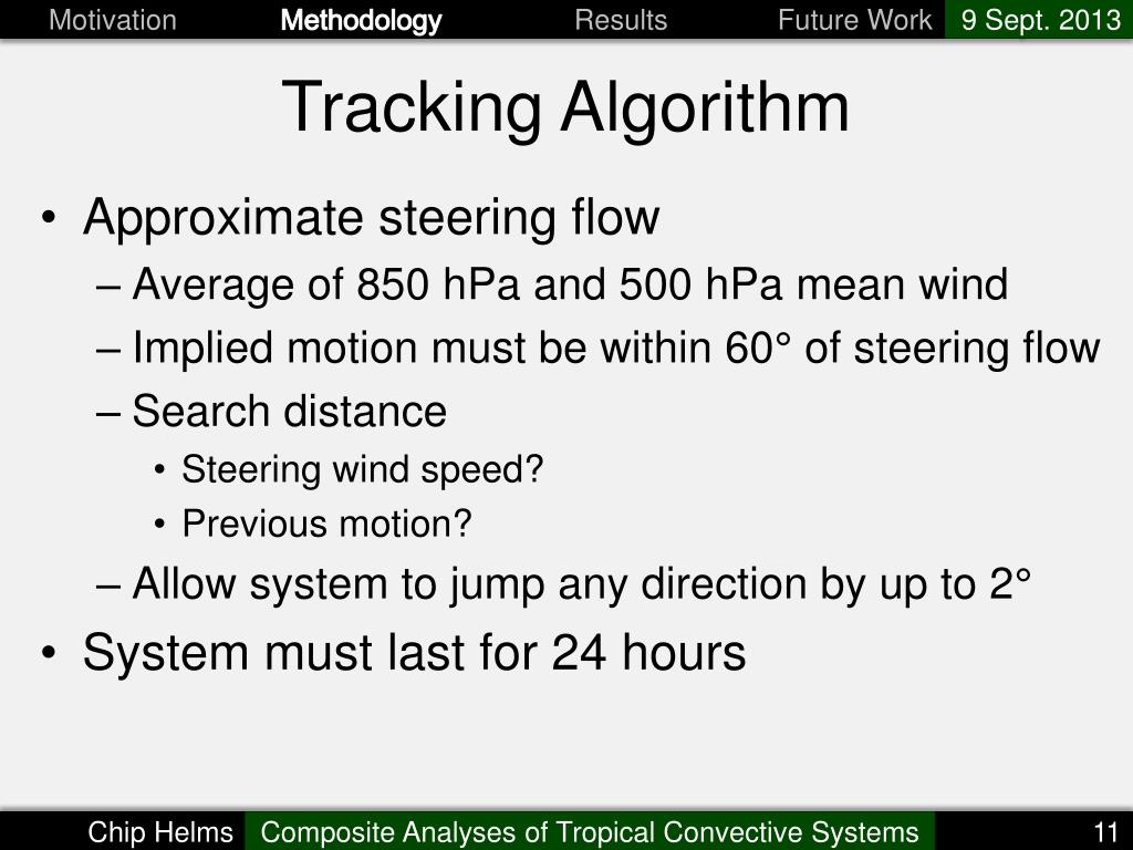 Methodology Tracking Algorithm • Approximate steering flow • Average of 850 hPa and 500 hPa mean wind • Implied motion must be within 60° of steering flow • Search distance • Steering wind speed? • Previous motion? • Allow system to jump any direction by up to 2° • System must last for 24 hours