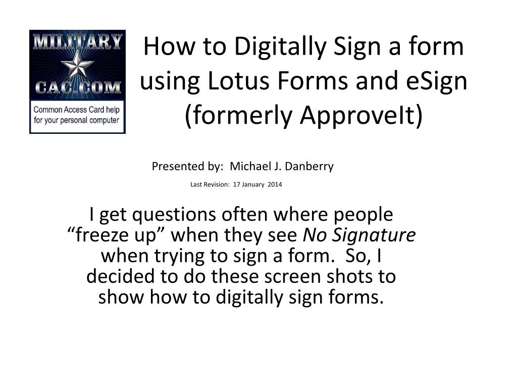 How to Digitally Sign a form using Lotus Forms and eSign (formerly ApproveIt) Presented by: Michael J. Danberry Last Revision: 17 January 2014 I get questions often where people “freeze up” when they see No Signature when trying to sign a form. So, I decided to do these screen shots to show how to digitally sign forms.