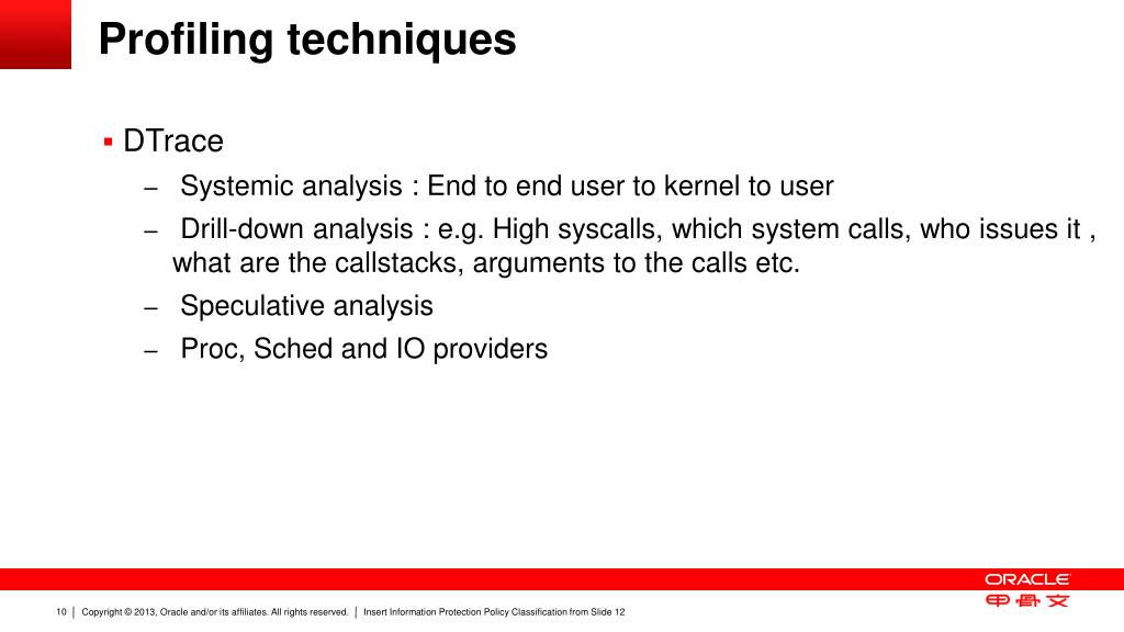 Profiling techniques • DTrace • Systemic analysis : End to end user to kernel to user • Drill-down analysis : e.g. High syscalls, which system calls, who issues it , what are the callstacks, arguments to the calls etc. • Speculative analysis • Proc, Sched and IO providers