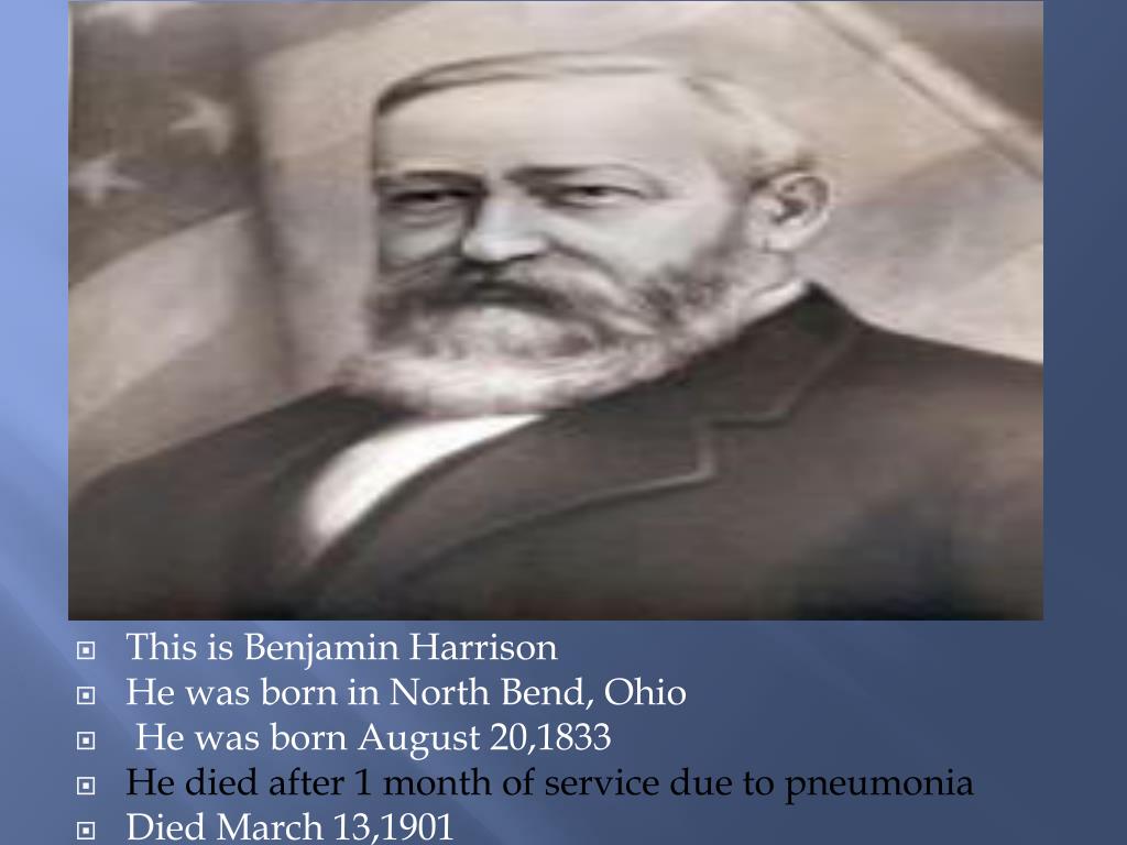 This is Benjamin Harrison • He was born in North Bend, Ohio • He was born August 20,1833 • He died after 1 month of service due to pneumonia • Died March 13,1901