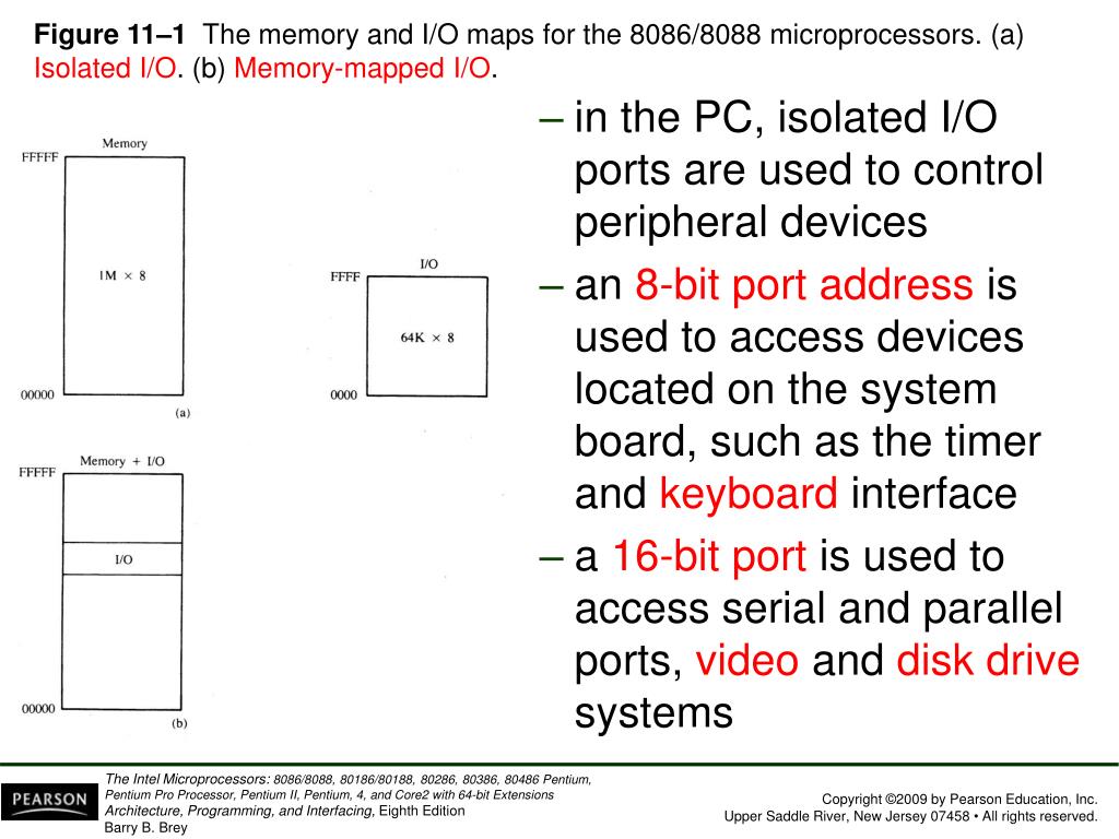 Figure 11–1 The memory and I/O maps for the 8086/8088 microprocessors. (a) Isolated I/O. (b) Memory-mapped I/O. • in the PC, isolated I/Oports are used to control peripheral devices • an 8-bit port address is used to access devices located on the system board, such as the timer and keyboard interface • a 16-bit port is used to access serial and parallel ports, video and disk drive systems