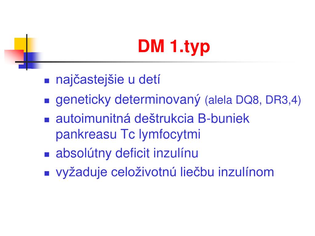 DM 1.typ • najčastejšie u detí • geneticky determinovaný(alela DQ8, DR3,4) • autoimunitná deštrukcia B-buniek pankreasu Tc lymfocytmi • absolútny deficit inzulínu • vyžaduje celoživotnú liečbu inzulínom