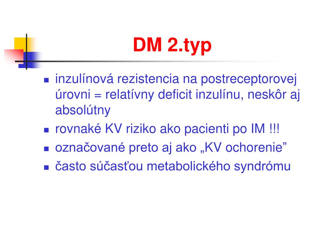DM 2.typ • inzulínová rezistencia na postreceptorovej úrovni = relatívny deficit inzulínu, neskôr aj absolútny • rovnaké KV riziko ako pacienti po IM !!! • označované preto aj ako „KV ochorenie” • často súčasťou metabolického syndrómu