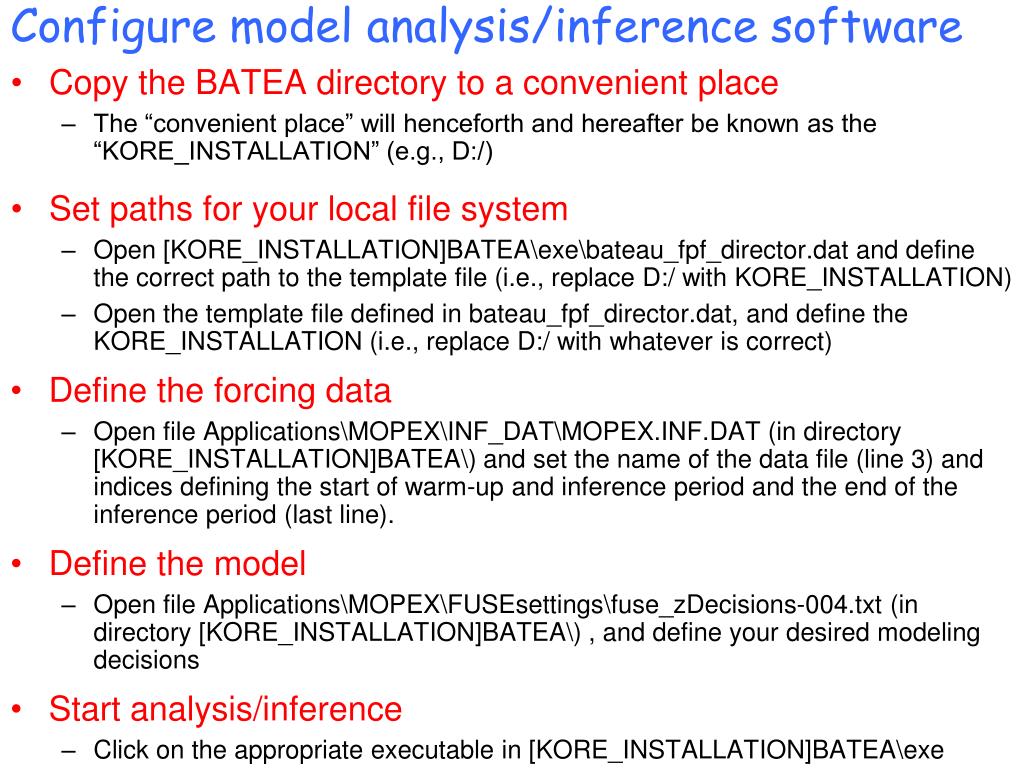 Configure model analysis/inference software • Copy the BATEA directory to a convenient place • The “convenient place” will henceforth and hereafter be known as the “KORE_INSTALLATION” (e.g., D:/) • Set paths for your local file system • Open [KORE_INSTALLATION]BATEA\exe\bateau_fpf_director.dat and define the correct path to the template file (i.e., replace D:/ with KORE_INSTALLATION) • Open the template file defined in bateau_fpf_director.dat, and define the KORE_INSTALLATION (i.e., replace D:/ with whatever is correct) • Define the forcing data • Open file Applications\MOPEX\INF_DAT\MOPEX.INF.DAT (in directory [KORE_INSTALLATION]BATEA\) and set the name of the data file (line 3) and indices defining the start of warm-up and inference period and the end of the inference period (last line). • Define the model • Open file Applications\MOPEX\FUSEsettings\fuse_zDecisions-004.txt (in directory [KORE_INSTALLATION]BATEA\) , and define your desired modeling decisions • Start analysis/inference • Click on the appropriate executable in [KORE_INSTALLATION]BATEA\exe