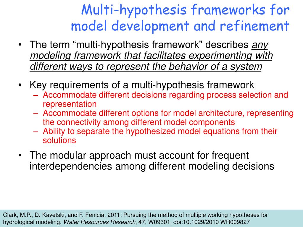Multi-hypothesis frameworks formodel development and refinement • The term “multi-hypothesis framework” describes any modeling framework that facilitates experimenting with different ways to represent the behavior of a system • Key requirements of a multi-hypothesis framework • Accommodate different decisions regarding process selection and representation • Accommodate different options for model architecture, representing the connectivity among different model components • Ability to separate the hypothesized model equations from their solutions • The modular approach must account for frequent interdependencies among different modeling decisions Clark, M.P., D. Kavetski, and F. Fenicia, 2011: Pursuing the method of multiple working hypotheses for hydrological modeling. Water Resources Research, 47, W09301, doi:10.1029/2010 WR009827