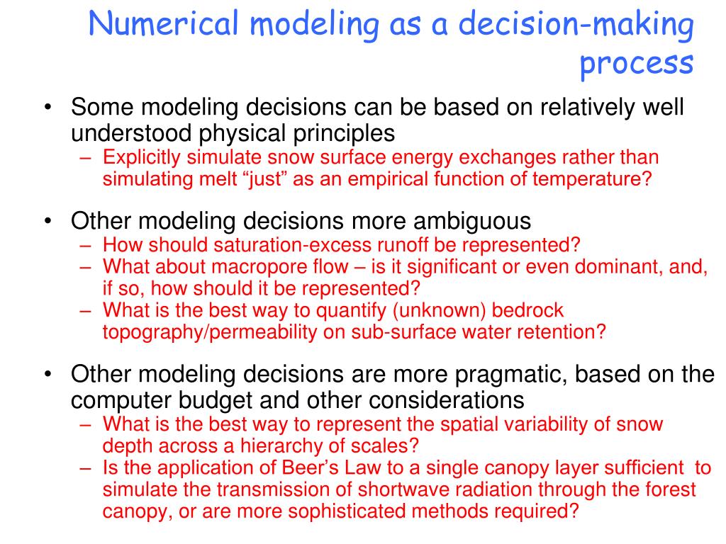 Numerical modeling as a decision-making process • Some modeling decisions can be based on relatively well understood physical principles • Explicitly simulate snow surface energy exchanges rather than simulating melt “just” as an empirical function of temperature? • Other modeling decisions more ambiguous • How should saturation-excess runoff be represented? • What about macropore flow – is it significant or even dominant, and, if so, how should it be represented? • What is the best way to quantify (unknown) bedrock topography/permeability on sub-surface water retention? • Other modeling decisions are more pragmatic, based on the computer budget and other considerations • What is the best way to represent the spatial variability of snow depth across a hierarchy of scales? • Is the application of Beer’s Law to a single canopy layer sufficient to simulate the transmission of shortwave radiation through the forest canopy, or are more sophisticated methods required?