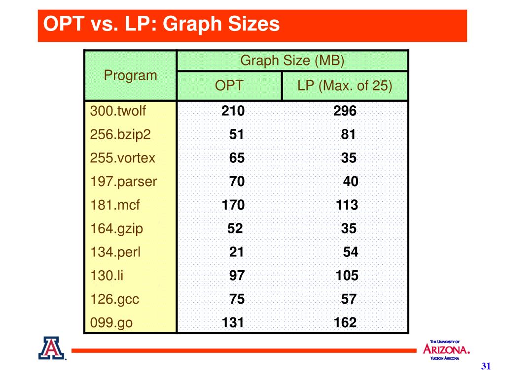 Graph Construction Cost • Trace Generation - Instrumented program takes twice as long to run as the uninstrumented program. • Trace Preprocessing for Graph Construction Time(LP) < Time(OPT) < Time(Traditional)