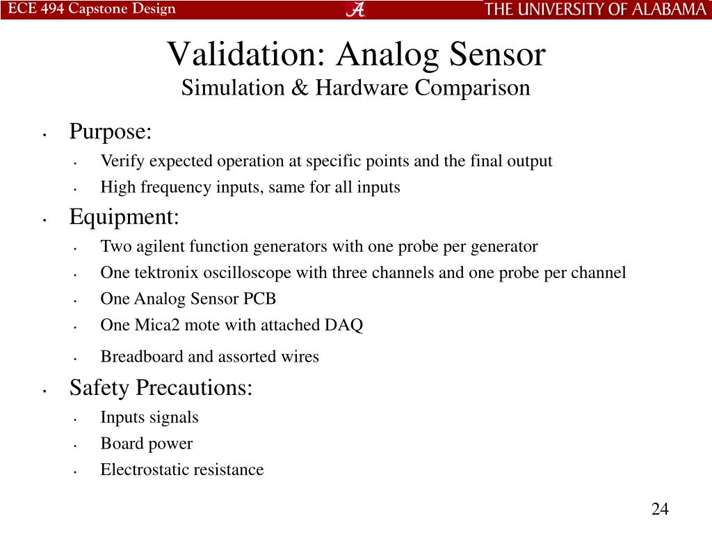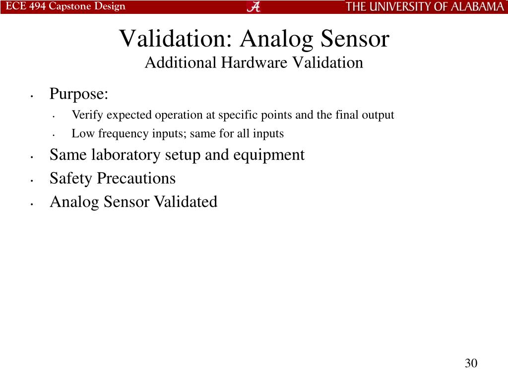 Validation: Analog Sensor Additional Hardware Validation • Purpose: • Verify expected operation at specific points and the final output • Low frequency inputs; same for all inputs • Same laboratory setup and equipment • Safety Precautions • Analog Sensor Validated