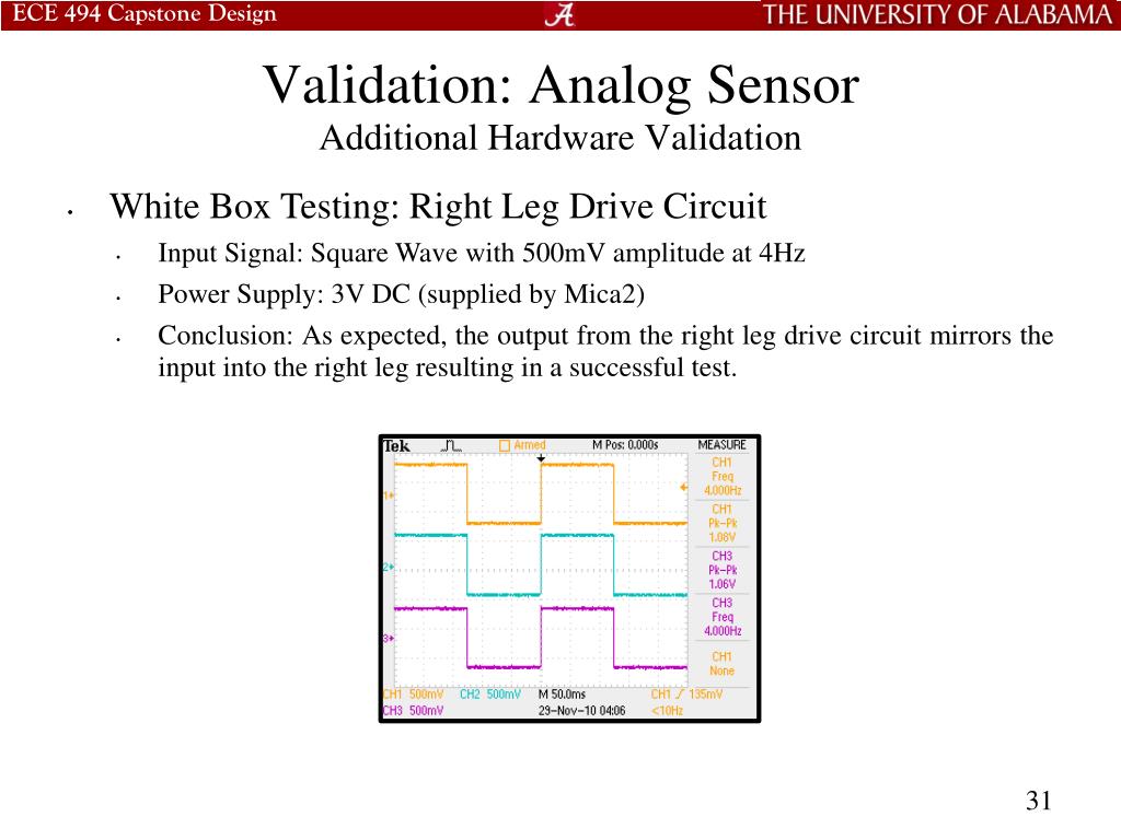 Validation: Analog Sensor Additional Hardware Validation • White Box Testing: Right Leg Drive Circuit • Input Signal: Square Wave with 500mV amplitude at 4Hz • Power Supply: 3V DC (supplied by Mica2) • Conclusion: As expected, the output from the right leg drive circuit mirrors the input into the right leg resulting in a successful test.