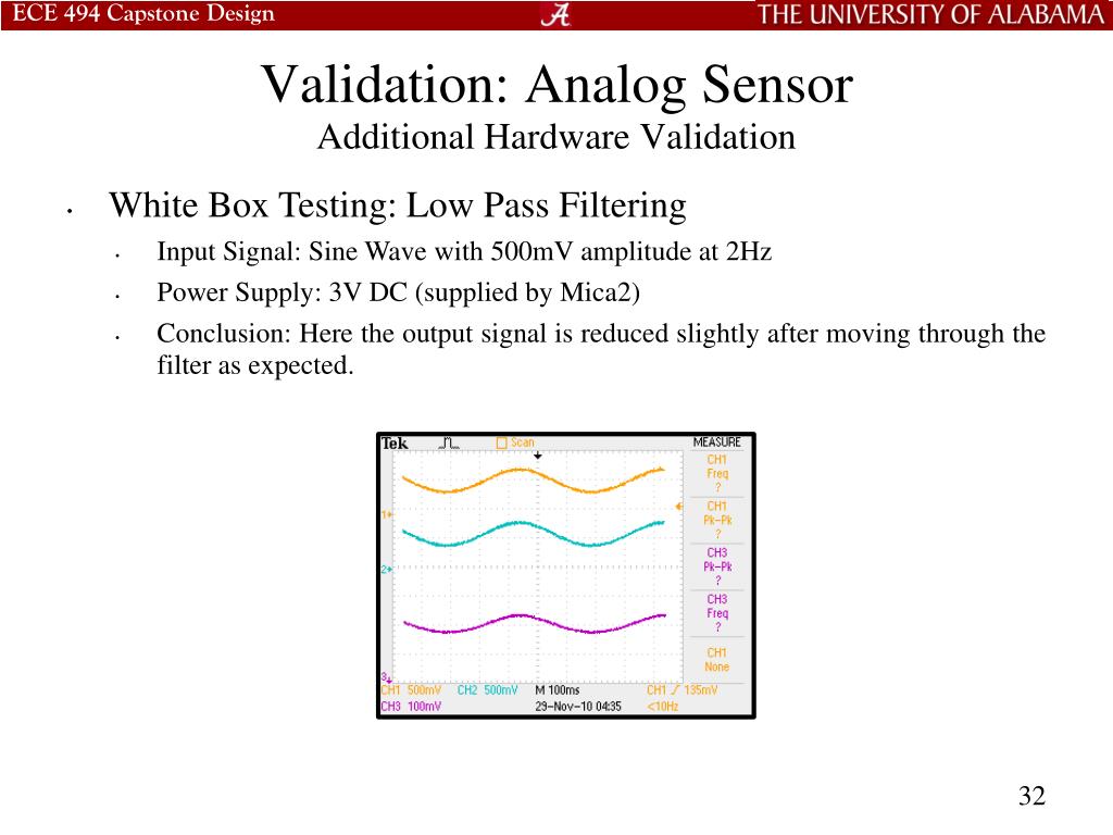 Validation: Analog Sensor Additional Hardware Validation • White Box Testing: Low Pass Filtering • Input Signal: Sine Wave with 500mV amplitude at 2Hz • Power Supply: 3V DC (supplied by Mica2) • Conclusion: Here the output signal is reduced slightly after moving through the filter as expected.