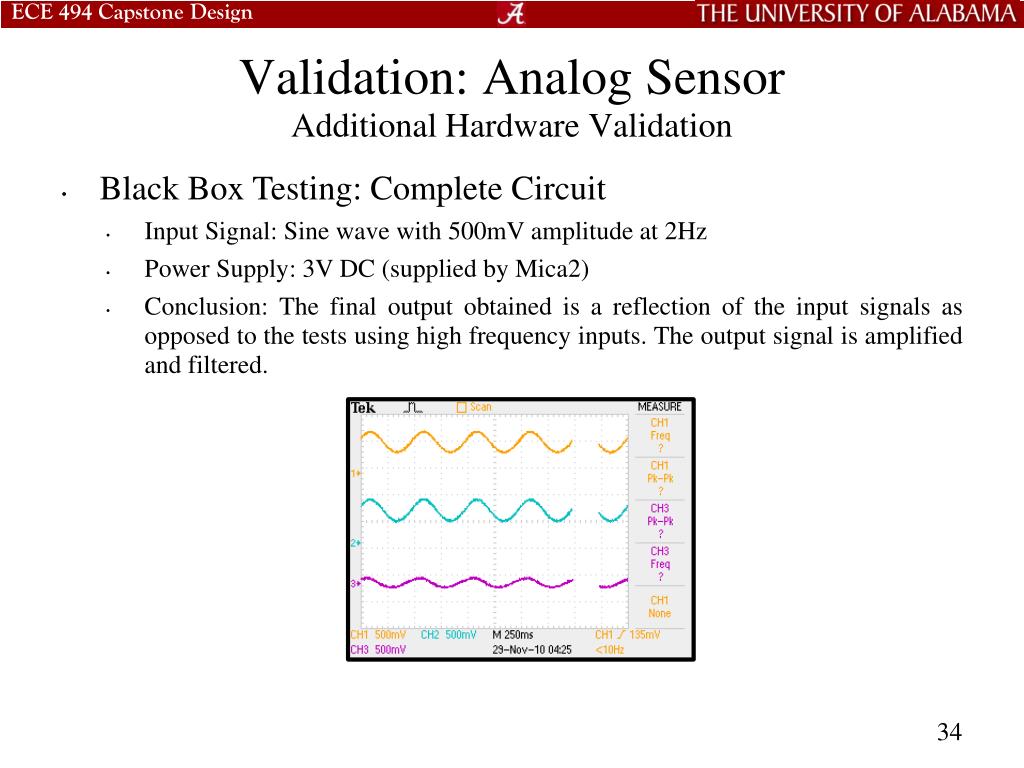 Validation: Analog Sensor Additional Hardware Validation • Black Box Testing: Complete Circuit • Input Signal: Sine wave with 500mV amplitude at 2Hz • Power Supply: 3V DC (supplied by Mica2) • Conclusion: The final output obtained is a reflection of the input signals as opposed to the tests using high frequency inputs. The output signal is amplified and filtered.