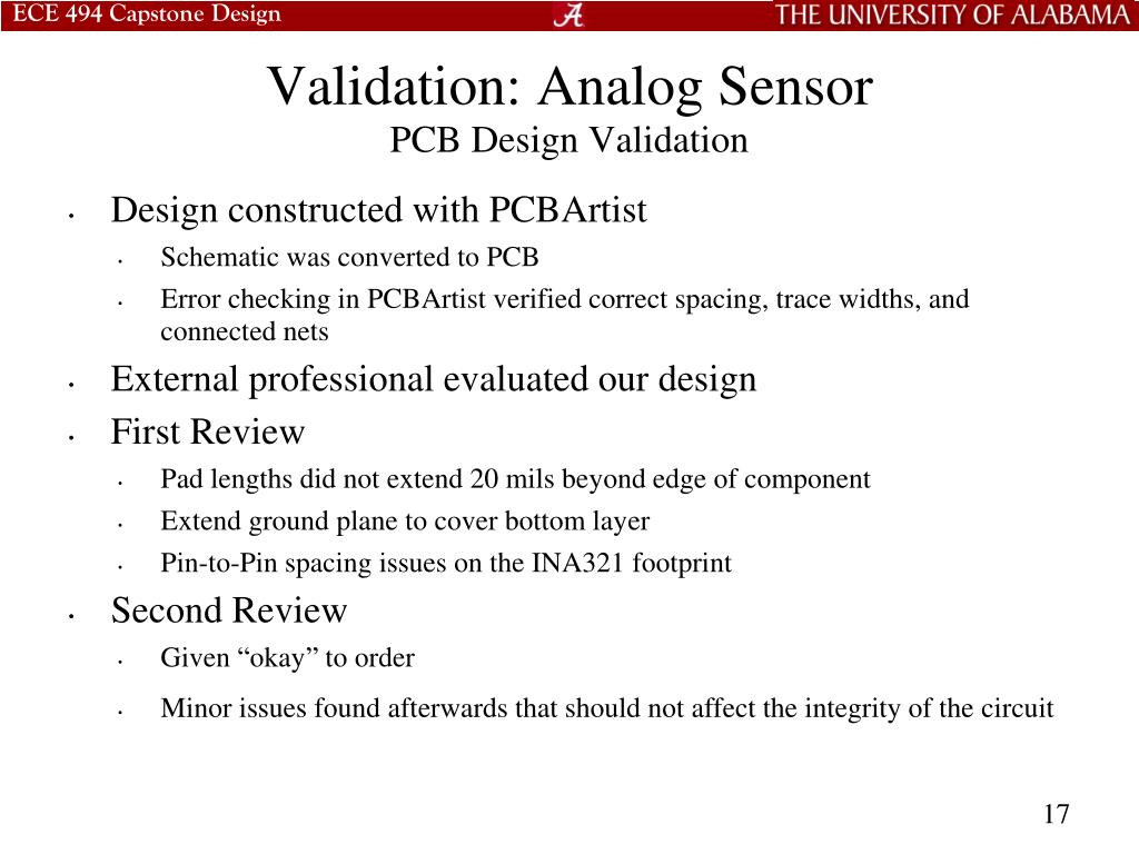 Validation: Analog Sensor PCB Design Validation • Design constructed with PCBArtist • Schematic was converted to PCB • Error checking in PCBArtist verified correct spacing, trace widths, and connected nets • External professional evaluated our design • First Review • Pad lengths did not extend 20 mils beyond edge of component • Extend ground plane to cover bottom layer • Pin-to-Pin spacing issues on the INA321 footprint • Second Review • Given “okay” to order • Minor issues found afterwards that should not affect the integrity of the circuit