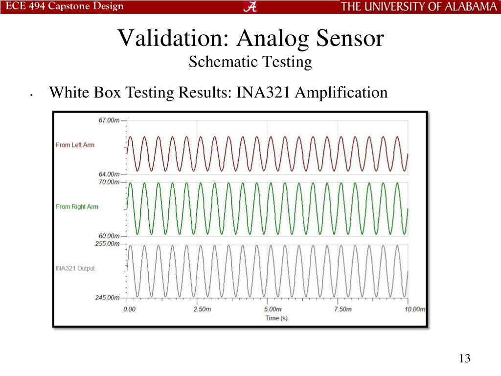 Validation: Analog Sensor Schematic Testing • White Box Testing: INA321 Amplification • Purpose: Verify the circuit will operate as expected given input signals and an input voltage in its operating range. • Input Signals: • Right Arm: 5mV with a frequency of 2kHz • Left Arm: 1mV with a frequency of 2kHz • Power Supply: 3V DC • Conclusion: Output voltage reflects an amplification of the two input signals by a factor of approximately 5. The test was successful.