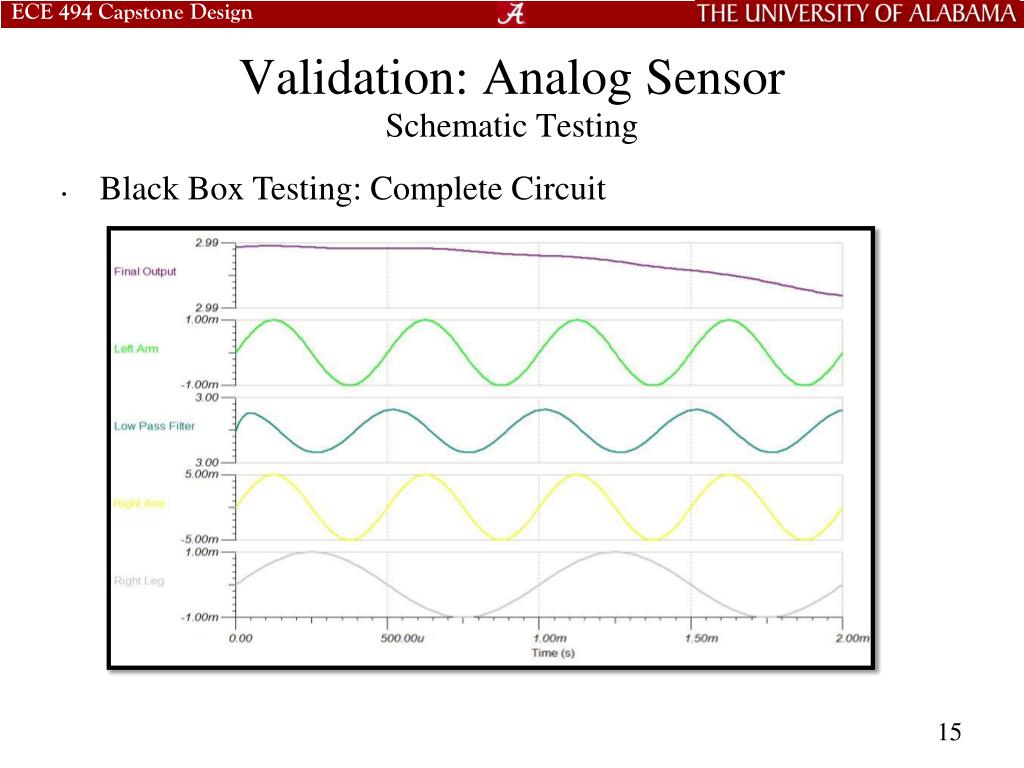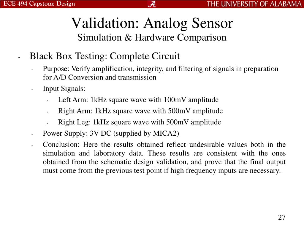 Validation: Analog Sensor Simulation & Hardware Comparison • Black Box Testing: Complete Circuit • Purpose: Verify amplification, integrity, and filtering of signals in preparation for A/D Conversion and transmission • Input Signals: • Left Arm: 1kHz square wave with 100mV amplitude • Right Arm: 1kHz square wave with 500mV amplitude • Right Leg: 1kHz square wave with 500mV amplitude • Power Supply: 3V DC (supplied by MICA2) • Conclusion: Here the results obtained reflect undesirable values both in the simulation and laboratory data. These results are consistent with the ones obtained from the schematic design validation, and prove that the final output must come from the previous test point if high frequency inputs are necessary.