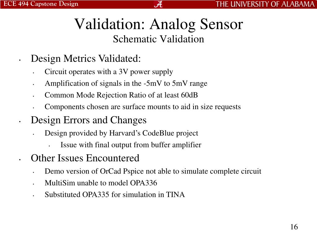 Validation: Analog Sensor Schematic Validation • Design Metrics Validated: • Circuit operates with a 3V power supply • Amplification of signals in the -5mV to 5mV range • Common Mode Rejection Ratio of at least 60dB • Components chosen are surface mounts to aid in size requests • Design Errors and Changes • Design provided by Harvard’s CodeBlue project • Issue with final output from buffer amplifier • Other Issues Encountered • Demo version of OrCadPspice not able to simulate complete circuit • MultiSim unable to model OPA336 • Substituted OPA335 for simulation in TINA