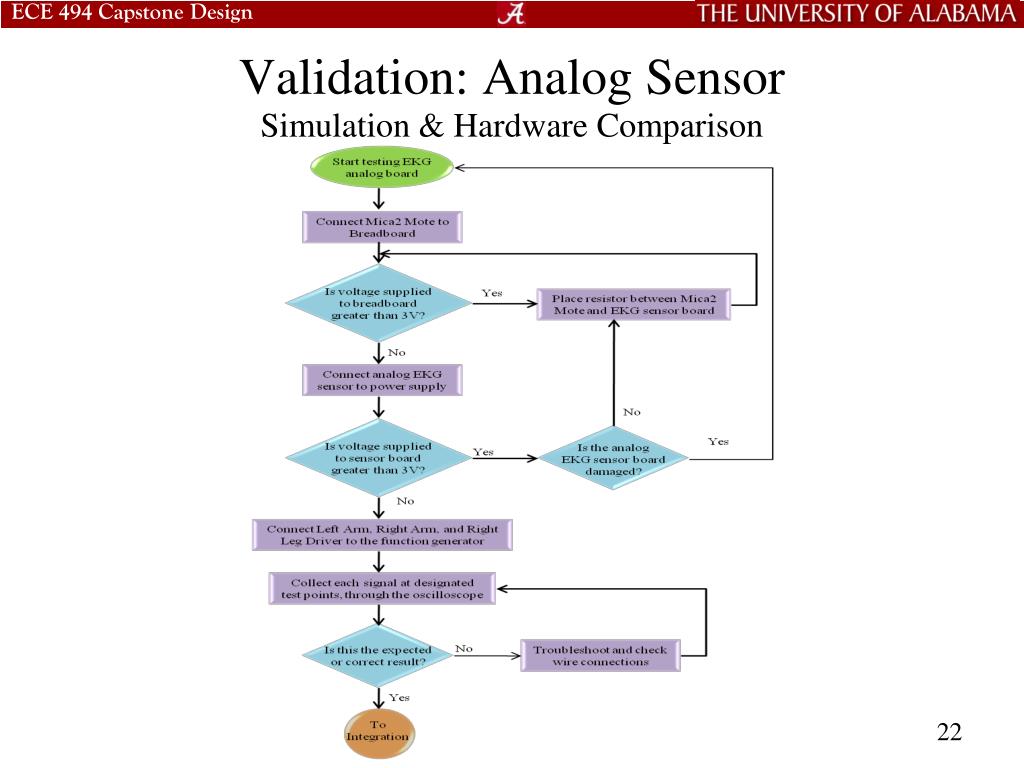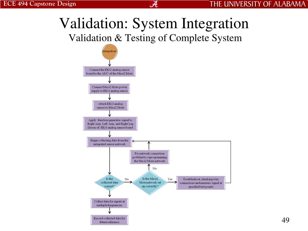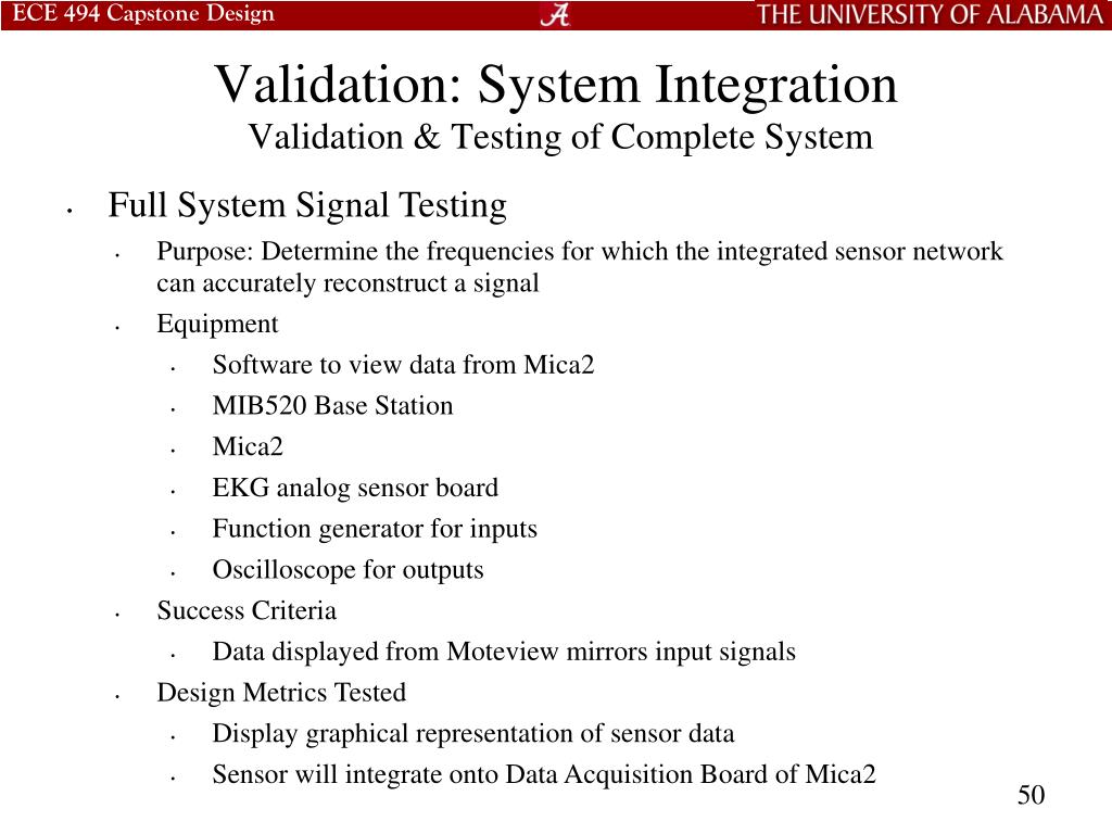 Validation: System Integration Validation & Testing of Complete System • Full System Signal Testing • Purpose: Determine the frequencies for which the integrated sensor network can accurately reconstruct a signal • Equipment • Software to view data from Mica2 • MIB520 Base Station • Mica2 • EKG analog sensor board • Function generator for inputs • Oscilloscope for outputs • Success Criteria • Data displayed from Moteview mirrors input signals • Design Metrics Tested • Display graphical representation of sensor data • Sensor will integrate onto Data Acquisition Board of Mica2