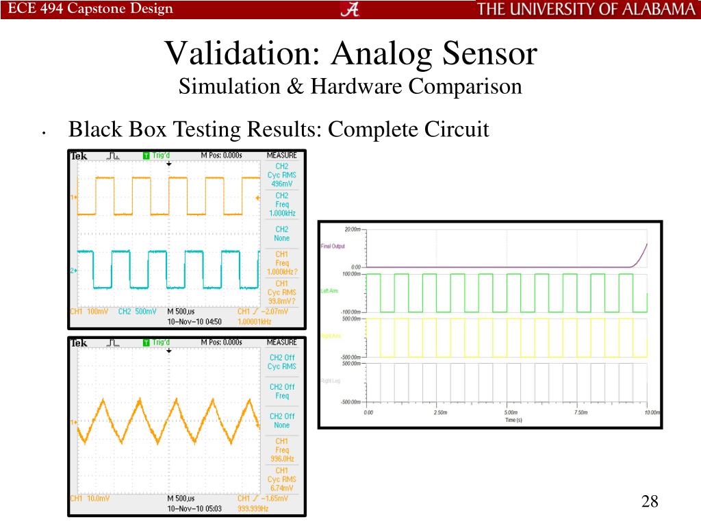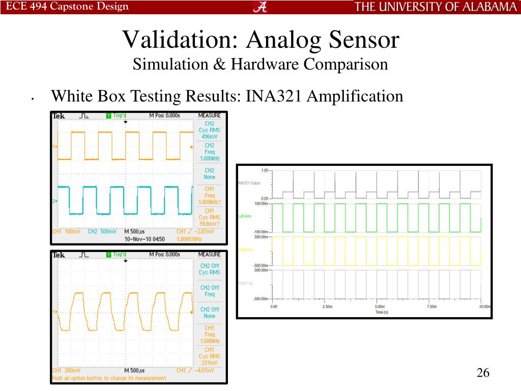 Validation: Analog Sensor Simulation & Hardware Comparison • White Box Testing: INA321 Amplification • Purpose: Verify the circuit will operate as expected given input signals and an input voltage in its operating range. • Input Signals: • Left Arm: 1kHz square wave with 100mV amplitude • Right Arm: 1kHz square wave with 500mV amplitude • Right Leg: 1kHz square wave with 500mV amplitude • Power Supply: 3V DC (supplied by MICA2) • Conclusion: Both the simulation and laboratory results depict an amplified version of the differential between the input signals. Overall the results obtained in the laboratory provide a better and more expected output than the simulation results.