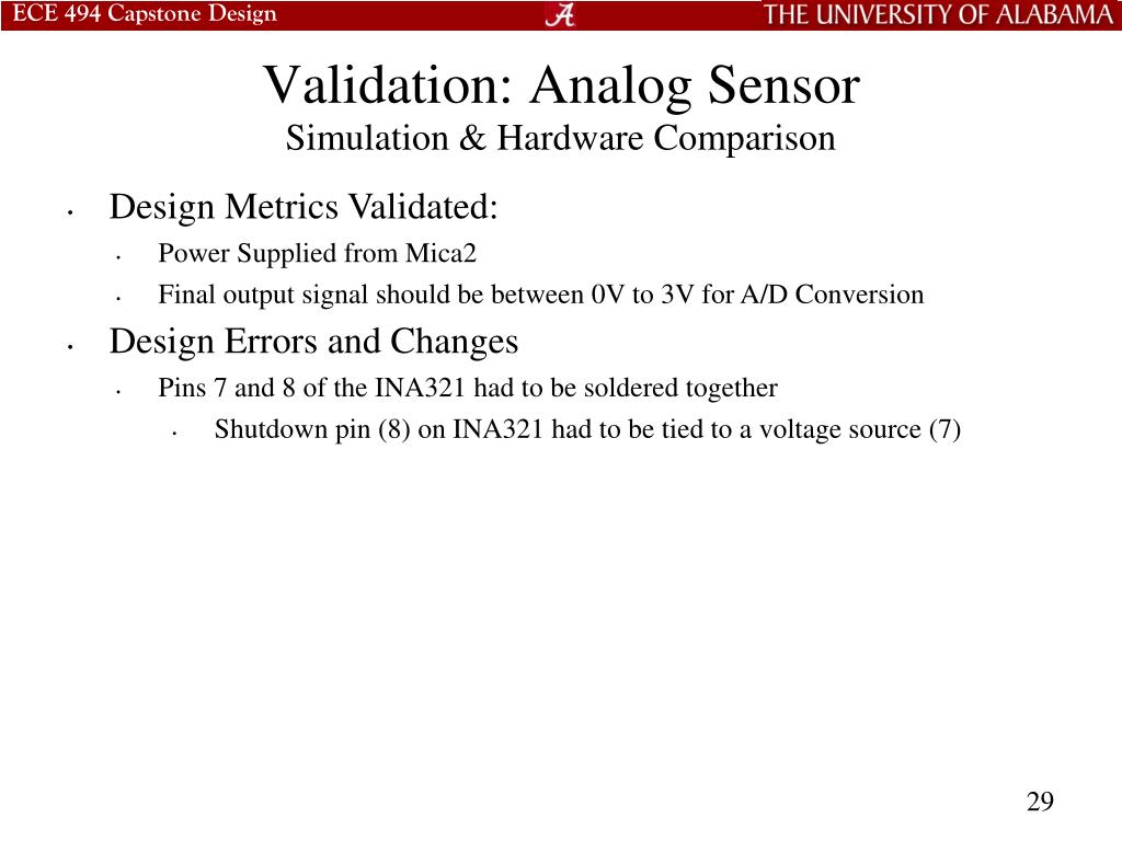 Validation: Analog Sensor Simulation & Hardware Comparison • Design Metrics Validated: • Power Supplied from Mica2 • Final output signal should be between 0V to 3V for A/D Conversion • Design Errors and Changes • Pins 7 and 8 of the INA321 had to be soldered together • Shutdown pin (8) on INA321 had to be tied to a voltage source (7)