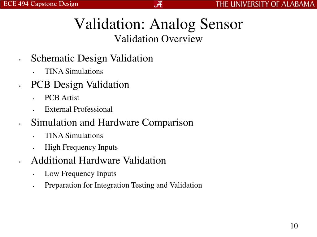 Validation: Analog Sensor Validation Overview • Schematic Design Validation • TINA Simulations • PCB Design Validation • PCB Artist • External Professional • Simulation and Hardware Comparison • TINA Simulations • High Frequency Inputs • Additional Hardware Validation • Low Frequency Inputs • Preparation for Integration Testing and Validation
