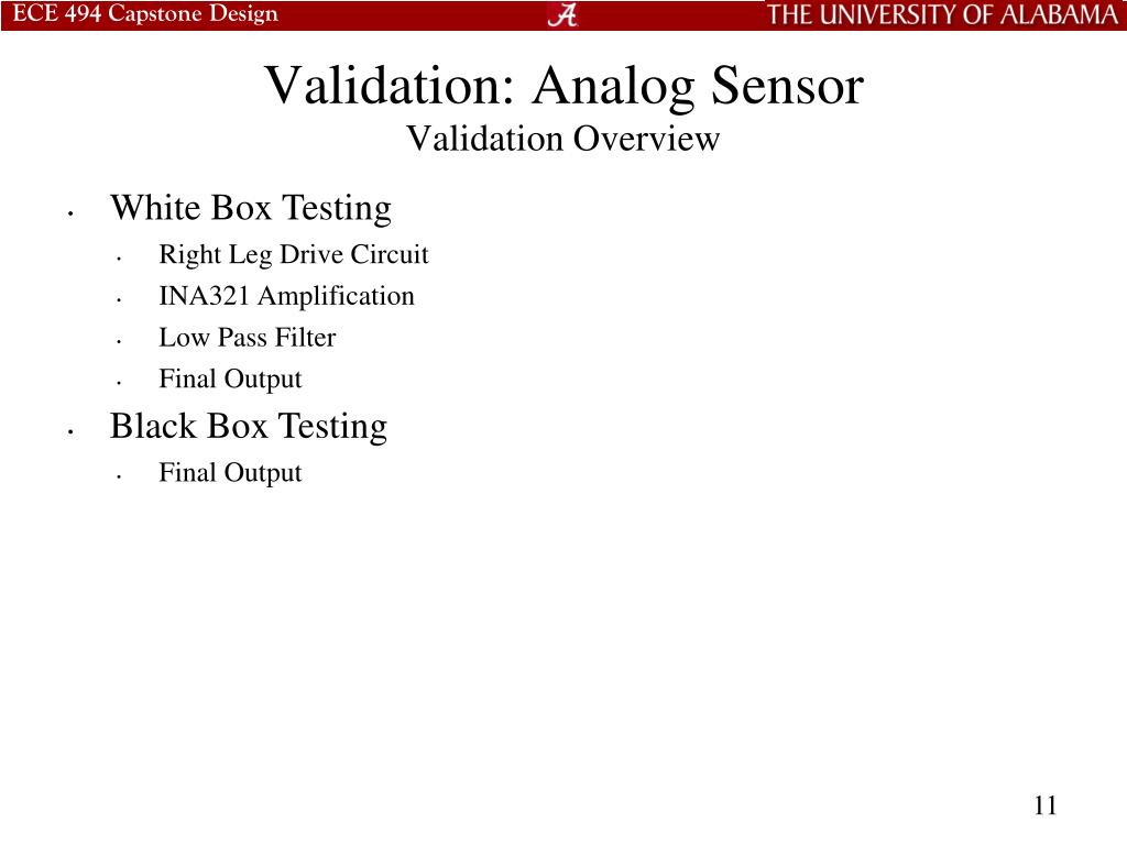 Validation: Analog Sensor Validation Overview • White Box Testing • Right Leg Drive Circuit • INA321 Amplification • Low Pass Filter • Final Output • Black Box Testing • Final Output