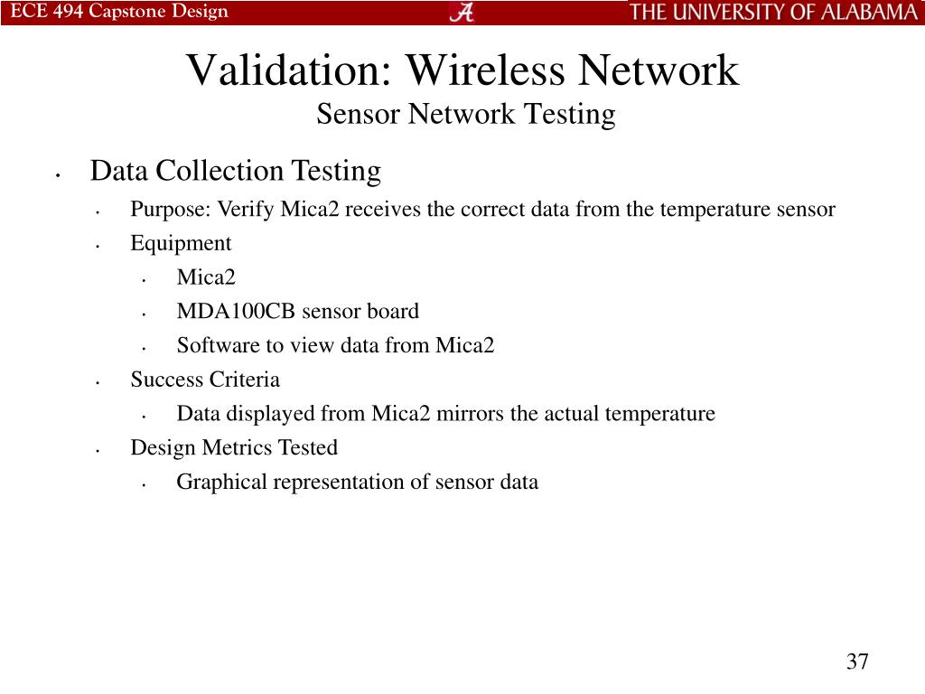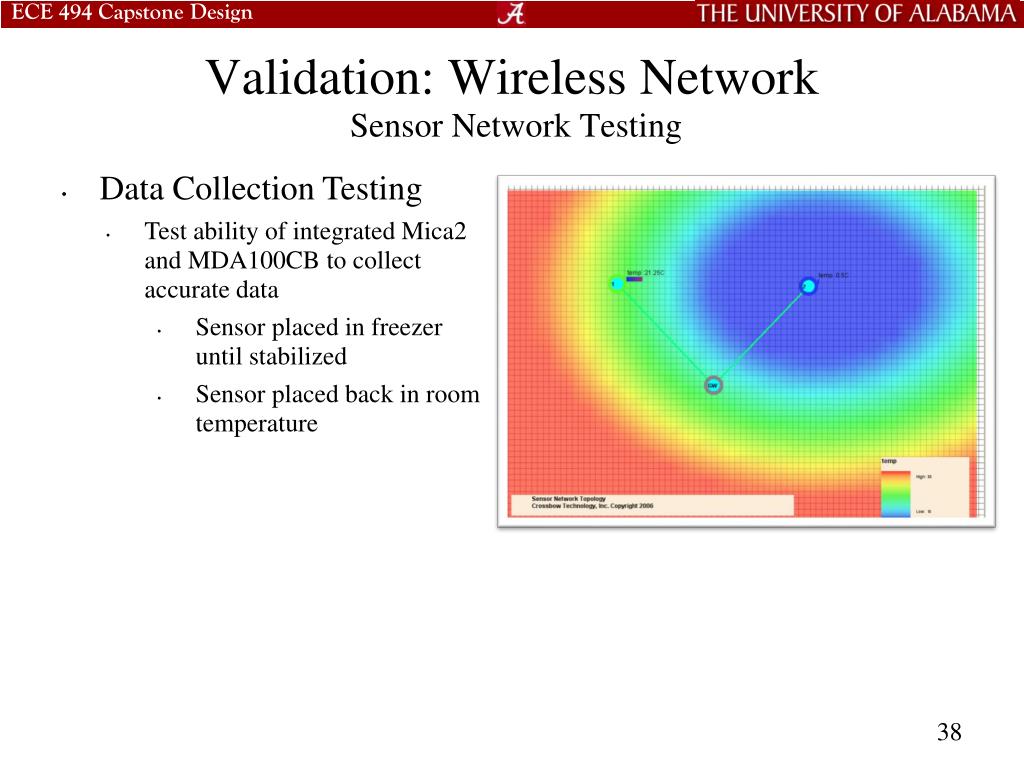 Validation: Wireless Network Sensor Network Testing • Data Collection Testing • Purpose: Verify Mica2 receives the correct data from the temperature sensor • Equipment • Mica2 • MDA100CB sensor board • Software to view data from Mica2 • Success Criteria • Data displayed from Mica2 mirrors the actual temperature • Design Metrics Tested • Graphical representation of sensor data