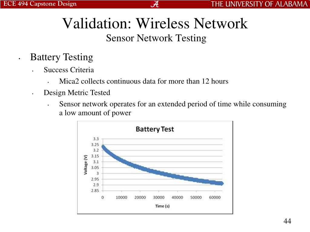 Validation: Wireless Network Sensor Network Testing • Battery Testing • Success Criteria • Mica2 collects continuous data for more than 12 hours • Design Metric Tested • Sensor network operates for an extended period of time while consuming a low amount of power