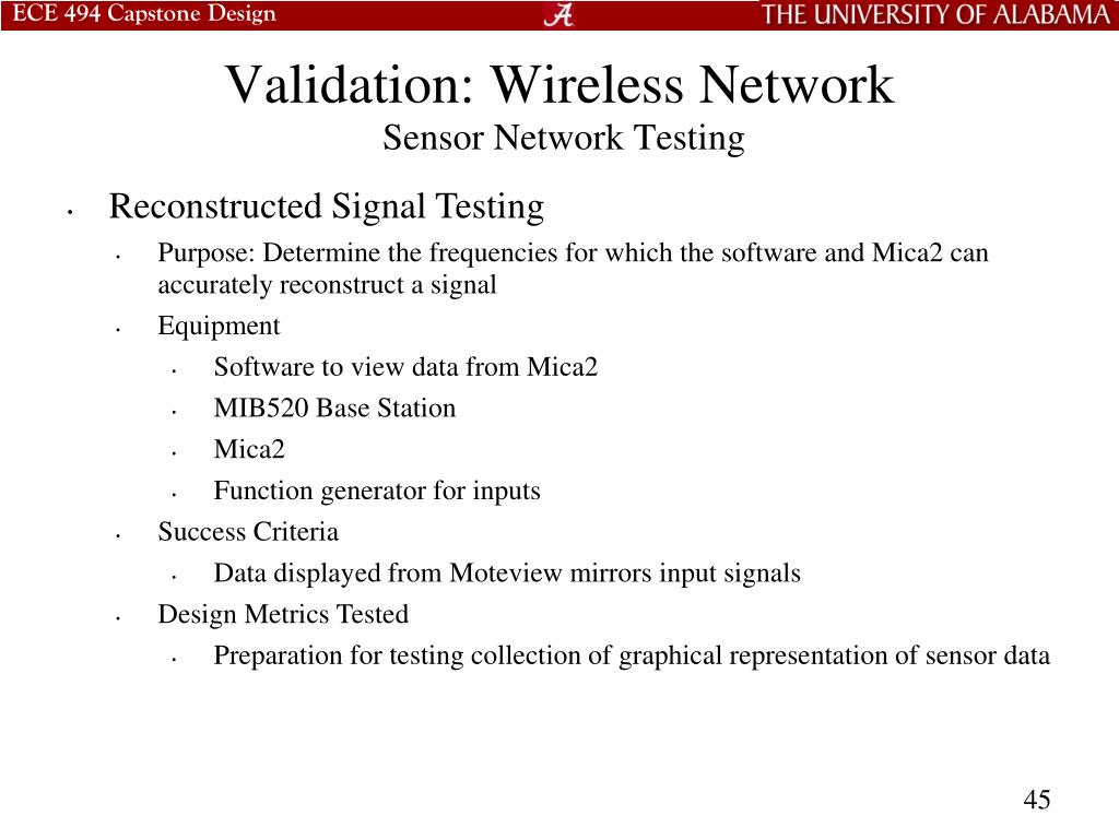 Validation: Wireless Network Sensor Network Testing • Reconstructed Signal Testing • Purpose: Determine the frequencies for which the software and Mica2 can accurately reconstruct a signal • Equipment • Software to view data from Mica2 • MIB520 Base Station • Mica2 • Function generator for inputs • Success Criteria • Data displayed from Moteview mirrors input signals • Design Metrics Tested • Preparation for testing collection of graphical representation of sensor data