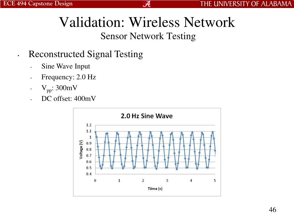 Validation: Wireless Network Sensor Network Testing • Reconstructed Signal Testing • Sine Wave Input • Frequency: 2.0 Hz • Vpp: 300mV • DC offset: 400mV