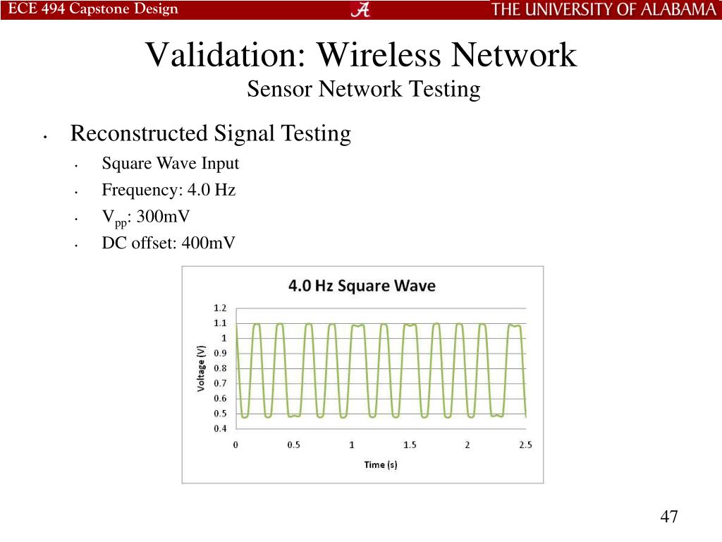 Validation: Wireless Network Sensor Network Testing • Reconstructed Signal Testing • Square Wave Input • Frequency: 4.0 Hz • Vpp: 300mV • DC offset: 400mV
