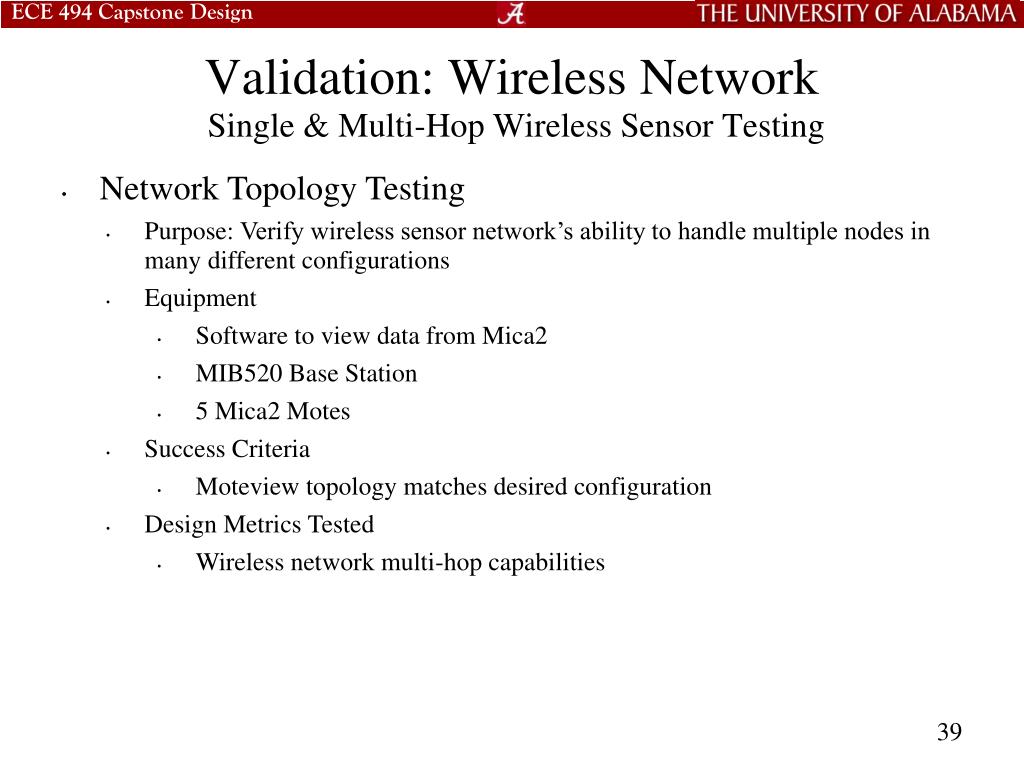 Validation: Wireless Network Single & Multi-Hop Wireless Sensor Testing • Network Topology Testing • Purpose: Verify wireless sensor network’s ability to handle multiple nodes in many different configurations • Equipment • Software to view data from Mica2 • MIB520 Base Station • 5 Mica2 Motes • Success Criteria • Moteview topology matches desired configuration • Design Metrics Tested • Wireless network multi-hop capabilities