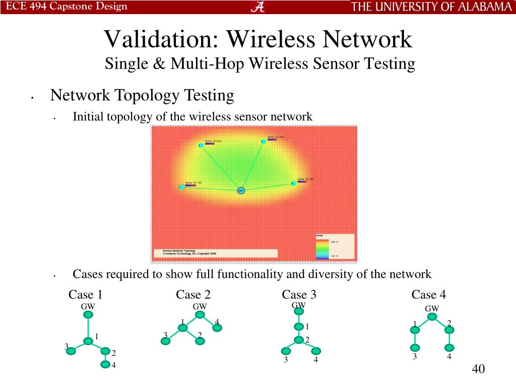 Validation: Wireless Network Single & Multi-Hop Wireless Sensor Testing GW GW 1 4 3 2 1 • Network Topology Testing 3 2 4 Case 1 Case 2