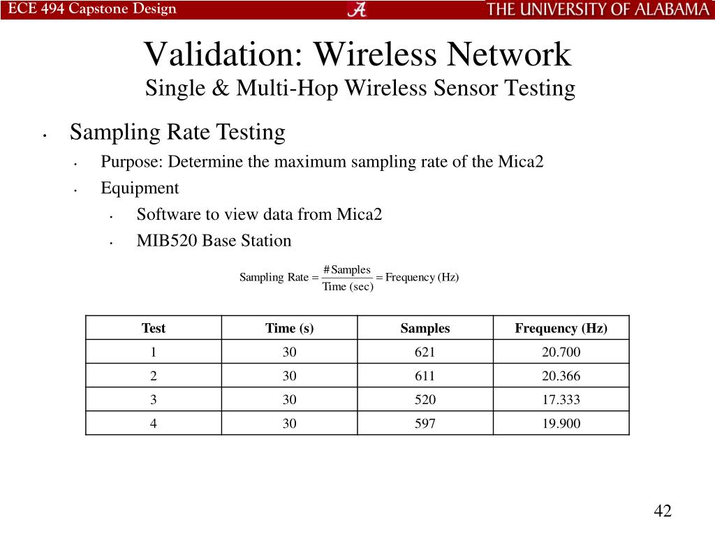 Validation: Wireless Network Single & Multi-Hop Wireless Sensor Testing • Sampling Rate Testing • Purpose: Determine the maximum sampling rate of the Mica2 • Equipment • Software to view data from Mica2 • MIB520 Base Station