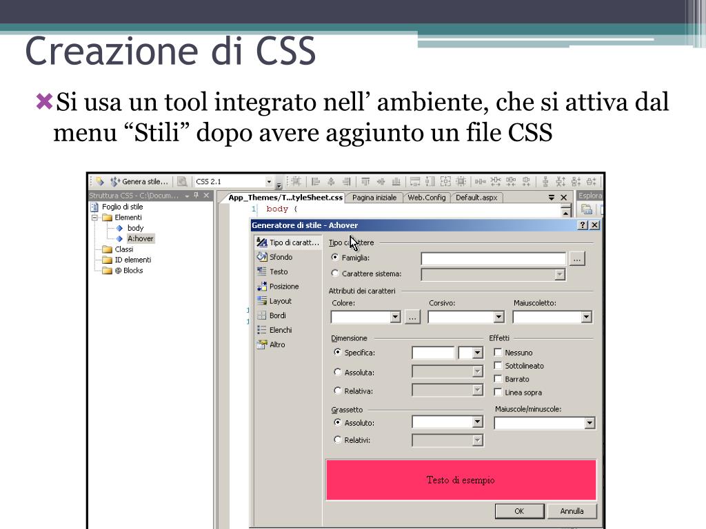 Creazione di CSS • Si usa un tool integrato nell’ ambiente, che si attiva dal menu “Stili” dopo avere aggiunto un file CSS