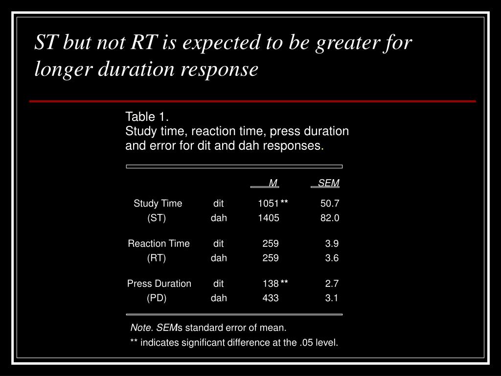 Table 1. Study time, reaction time, press duration and error for dit and dah responses. M SEM Study Time dit 1051 ** 50.7 (ST) dah 1405 82.0 Reaction Time dit 259 3.9 (RT) dah 259 3.6 Press Duration dit 138 ** 2.7 (PD) dah 433 3.1 ** indicates significant difference at the .05 level. Note. SEM is standard error of mean. ST but not RT is expected to be greater for longer duration response