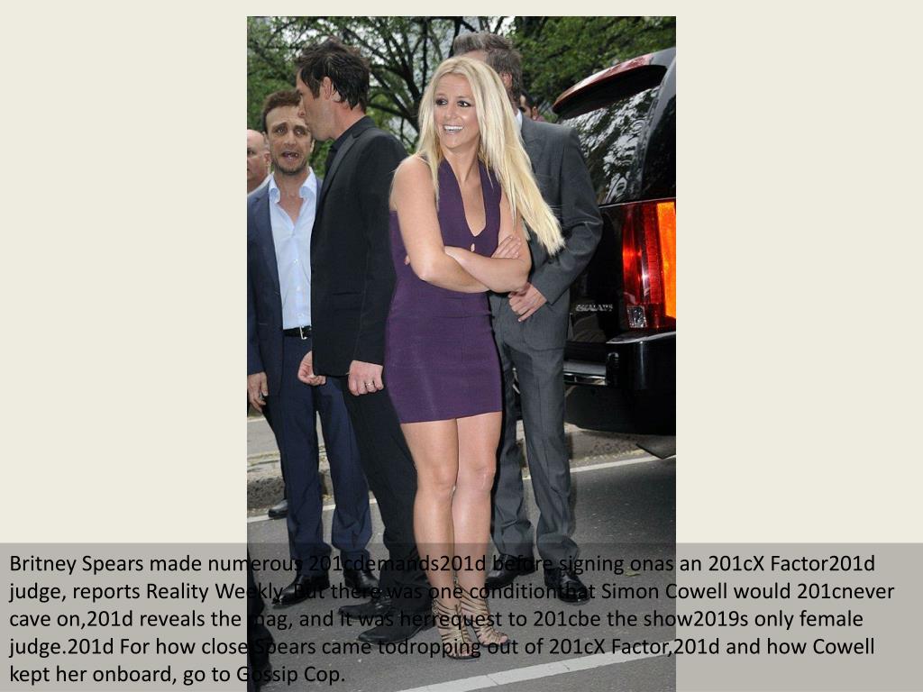 Britney Spears made numerous 201cdemands201d before signing onas an 201cX Factor201d judge, reports Reality Weekly. But there was one conditionthat Simon Cowell would 201cnever cave on,201d reveals the mag, and it was herrequest to 201cbe the show2019s only female judge.201d For how close Spears came todropping out of 201cX Factor,201d and how Cowell kept her onboard, go to Gossip Cop.