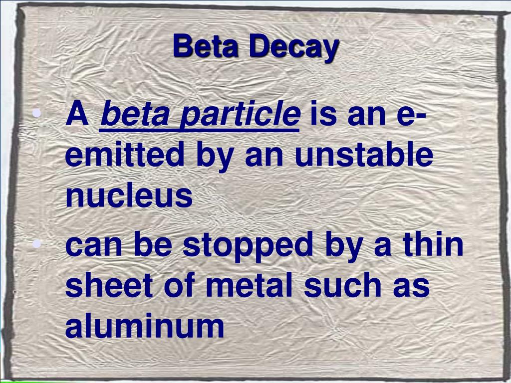Beta Decay A beta particle is an e- emitted by an unstable nucleus can be stopped by a thin sheet of metal such as aluminum