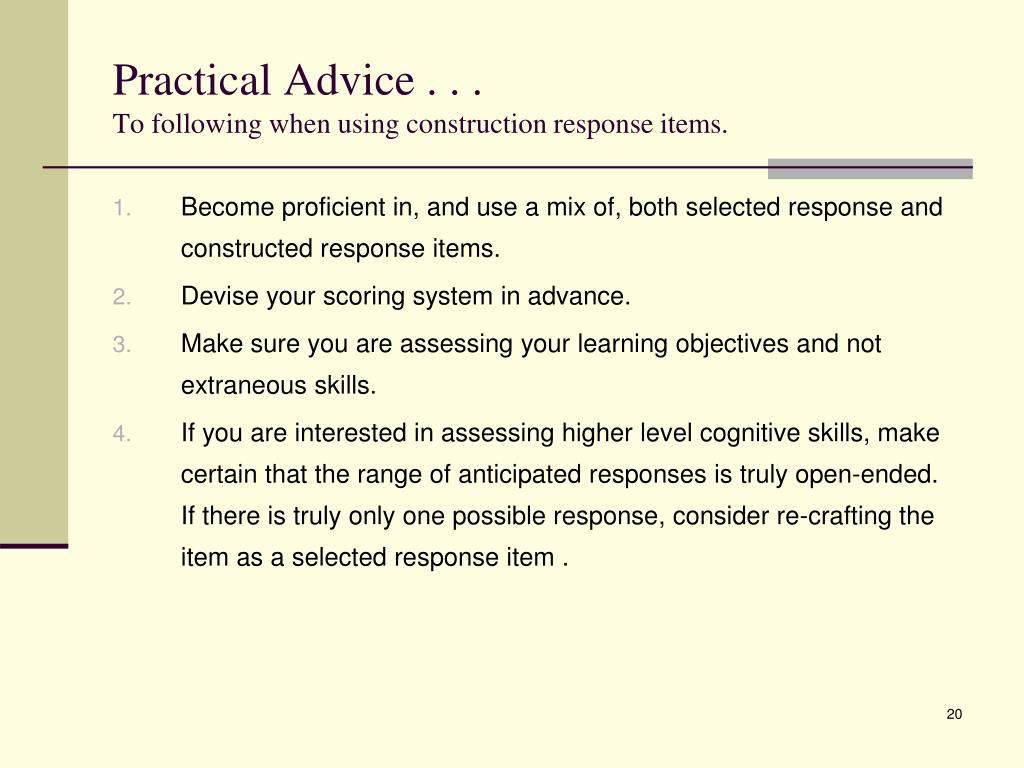Practical Advice . . .To following when using construction response items. • Become proficient in, and use a mix of, both selected response and constructed response items. • Devise your scoring system in advance. • Make sure you are assessing your learning objectives and not extraneous skills. • If you are interested in assessing higher level cognitive skills, make certain that the range of anticipated responses is truly open-ended. If there is truly only one possible response, consider re-crafting the item as a selected response item .