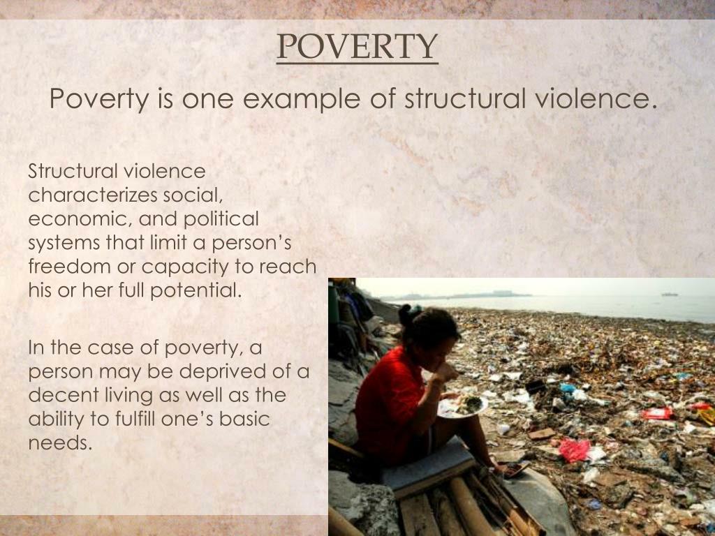 Poverty Poverty is one example of structural violence. Structural violence characterizes social, economic, and political systems that limit a person’s freedom or capacity to reach his or her full potential. In the case of poverty, a person may be deprived of a decent living as well as the ability to fulfill one’s basic needs.