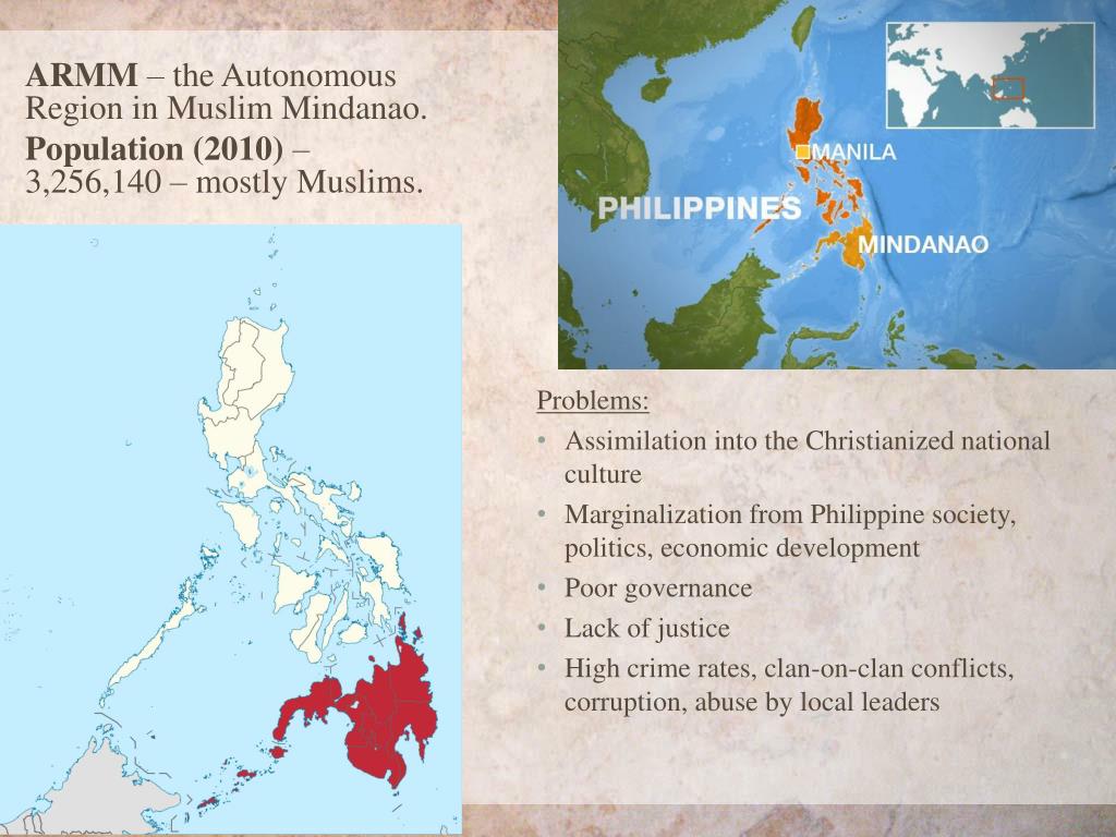 ARMM – the Autonomous Region in Muslim Mindanao. Population (2010) – 3,256,140 – mostly Muslims. Problems: • Assimilation into the Christianized national culture • Marginalization from Philippine society, politics, economic development • Poor governance • Lack of justice • High crime rates, clan-on-clan conflicts, corruption, abuse by local leaders