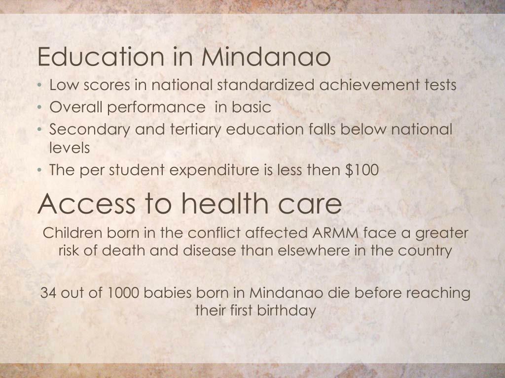Education in Mindanao • Low scores in national standardized achievement tests • Overall performance in basic • Secondary and tertiary education falls below national levels • The per student expenditure is less then $100 Access to health care Children born in the conflict affected ARMM face a greater risk of death and disease than elsewhere in the country 34 out of 1000 babies born in Mindanao die before reaching their first birthday