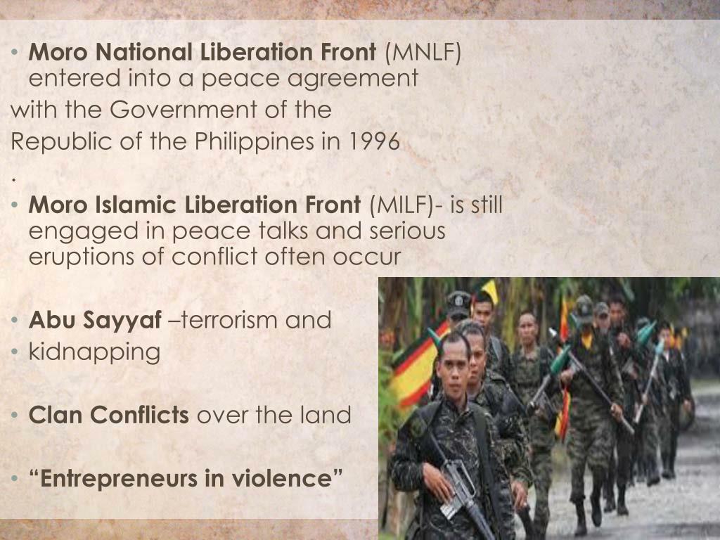 Moro National Liberation Front (MNLF) entered into a peace agreement with the Government of the Republic of the Philippines in 1996 . • Moro Islamic Liberation Front (MILF)- is still engaged in peace talks and serious eruptions of conflict often occur • Abu Sayyaf–terrorism and • kidnapping • Clan Conflicts over the land • “Entrepreneurs in violence”