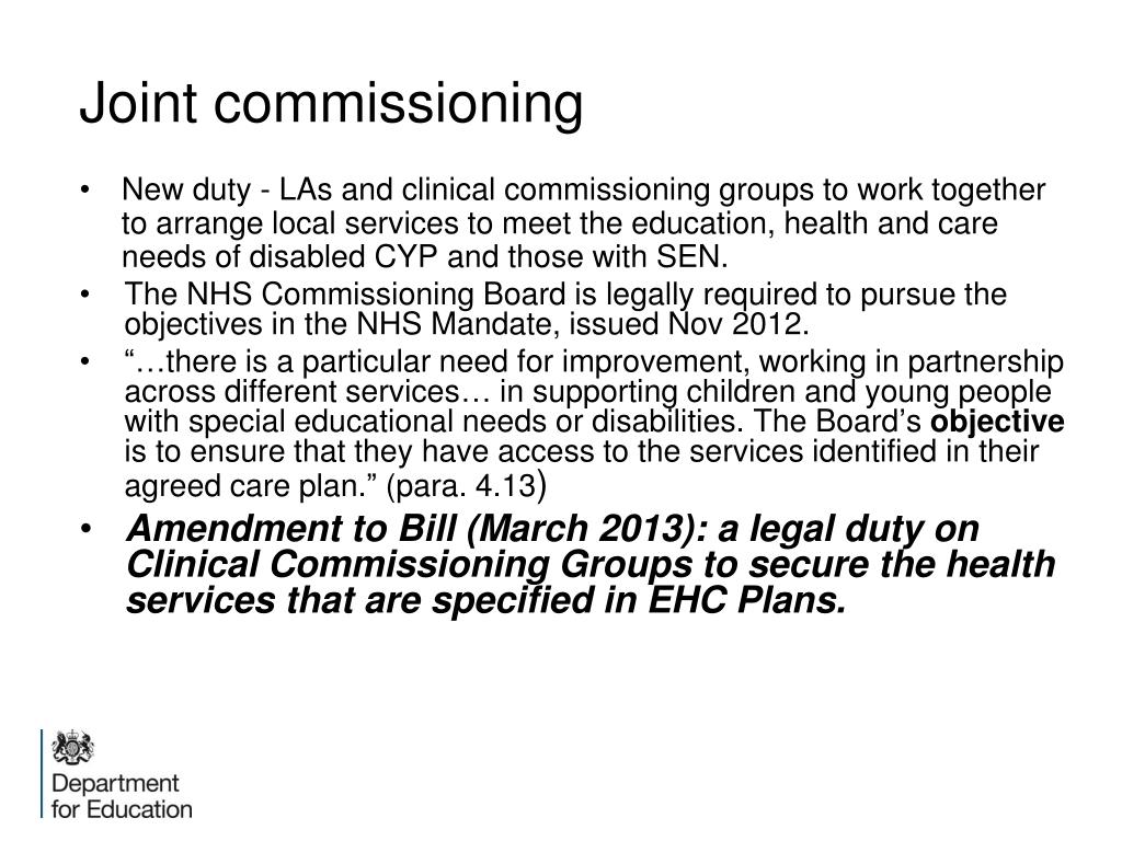 Joint commissioning New duty - LAs and clinical commissioning groups to work together to arrange local services to meet the education, health and care needs of disabled CYP and those with SEN. The NHS Commissioning Board is legally required to pursue the objectives in the NHS Mandate, issued Nov 2012. “…there is a particular need for improvement, working in partnership across different services… in supporting children and young people with special educational needs or disabilities. The Board’s objective is to ensure that they have access to the services identified in their agreed care plan.” (para. 4.13) Amendment to Bill (March 2013): a legal duty on Clinical Commissioning Groups to secure the health services that are specified in EHC Plans.