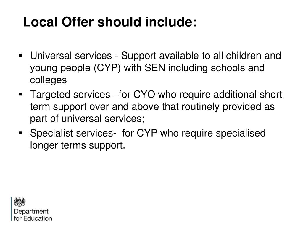 Local Offer should include: • Universal services - Support available to all children and young people (CYP) with SEN including schools and colleges • Targeted services –for CYO who require additional short term support over and above that routinely provided as part of universal services; • Specialist services- for CYP who require specialised longer terms support.