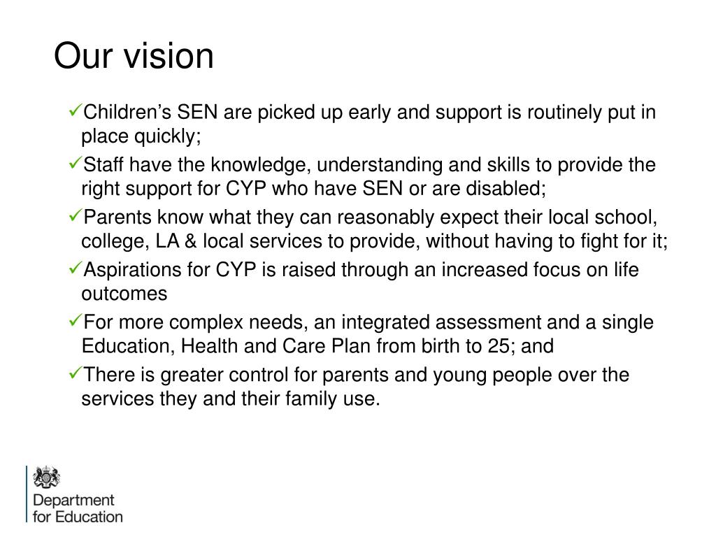 Our vision • Children’s SEN are picked up early and support is routinely put in place quickly; • Staff have the knowledge, understanding and skills to provide the right support for CYP who have SEN or are disabled; • Parents know what they can reasonably expect their local school, college, LA & local services to provide, without having to fight for it; • Aspirations for CYP is raised through an increased focus on life outcomes • For more complex needs, an integrated assessment and a single Education, Health and Care Plan from birth to 25; and • There is greater control for parents and young people over the services they and their family use.