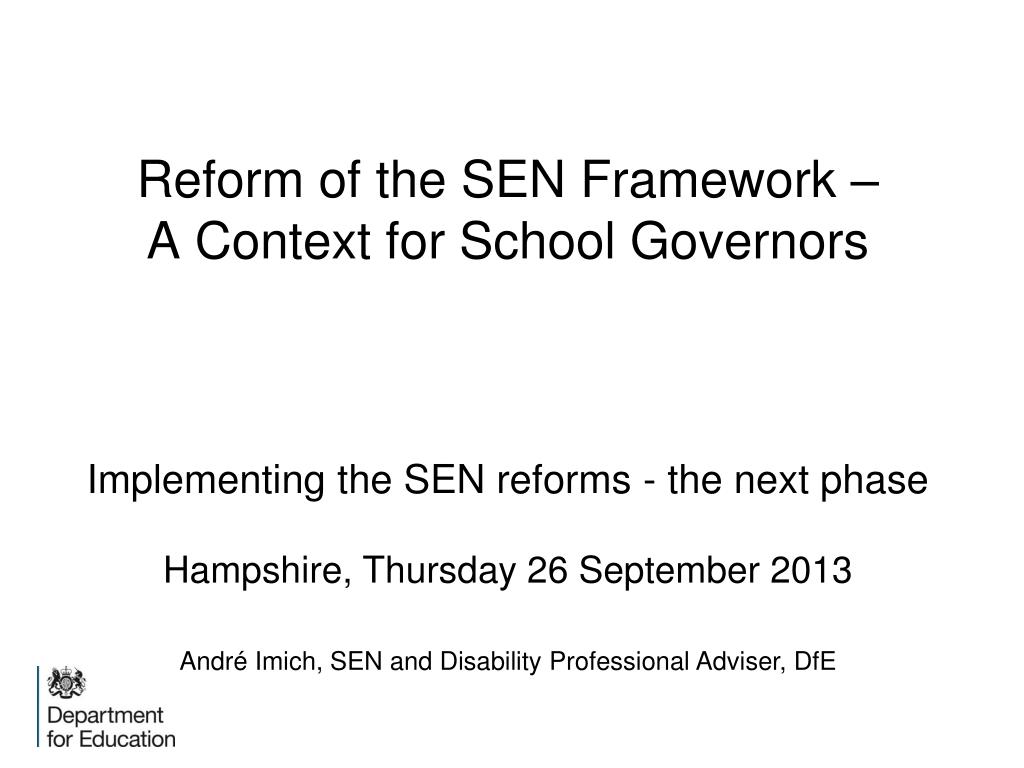 Reform of the SEN Framework – A Context for School GovernorsImplementing the SEN reforms - the next phaseHampshire, Thursday 26 September 2013 André Imich, SEN and Disability Professional Adviser, DfE